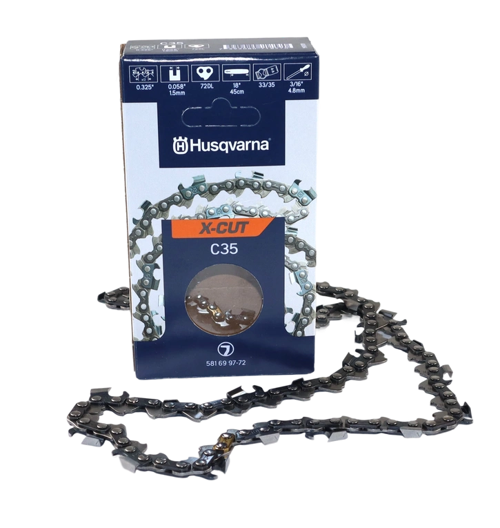Husqvarna X-CUT™ C35 to zaawansowany łańcuch typu pełne dłuto, o podziałce 0,325” i grubości ogniwa prowadzącego 1,5 mm/0,058”, do pilarek łańcuchowych o pojemności 45–60 cm3, przeznaczony do profesjonalnego użytku w pełnym wymiarze godzin. Łańcuch ten został opracowany przez firmę Husqvarna specjalnie dla pilarek łańcuchowych Husqvarna, aby zapewnić doskonałą wydajność cięcia dzięki doskonałej współpracy pomiędzy łańcuchem, prowadnicą i maszyną. Dzięki trwałym materiałom i solidnemu wykonaniu łańcuch ten zapewnia wysoką produktywność przez cały dzień pracy. Długotrwała ostrość i niska rozciągliwość również przyczyniają się do optymalnych wyników i niskich wymagań konserwacyjnych.