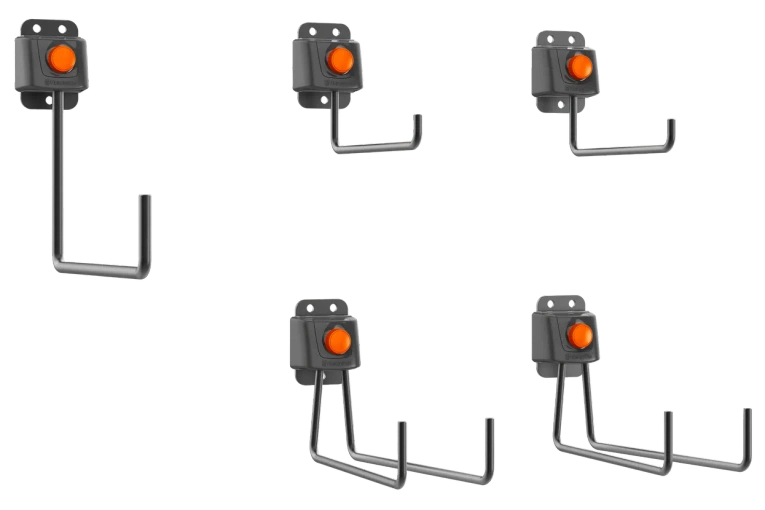Zestaw 5 haków jako uzupełnienie systemu przechowywania Aspire™ został zaprojektowany tak, aby pasował do pełnej gamy narzędzi Husqvarna Aspire™, a także do najczęściej używanych akcesoriów ogrodowych, takich jak narzędzia ręczne, wąż czy miotła.