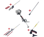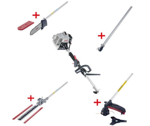 Urządzenie wielofunkcyjne spalinowe AL-KO BC 260 MT Multitool w zestawie okrzesywarka, kosa spalinowa z tarczą i głowicą oraz nożyce do żywopłotu.